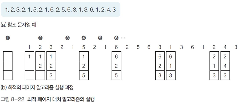 최적 페이지 대치 알고리즘 (OPT, OPTimal replacement algorithm)- 앞으로 가장 오랫동안 사용하지 않을 페이지를 대치한다