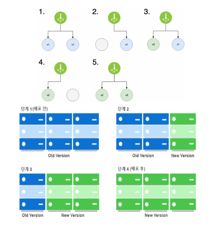 -롤링배포는 서버를 한대씩 구버전에서 새버전으로 교체해가는 전략이다.
