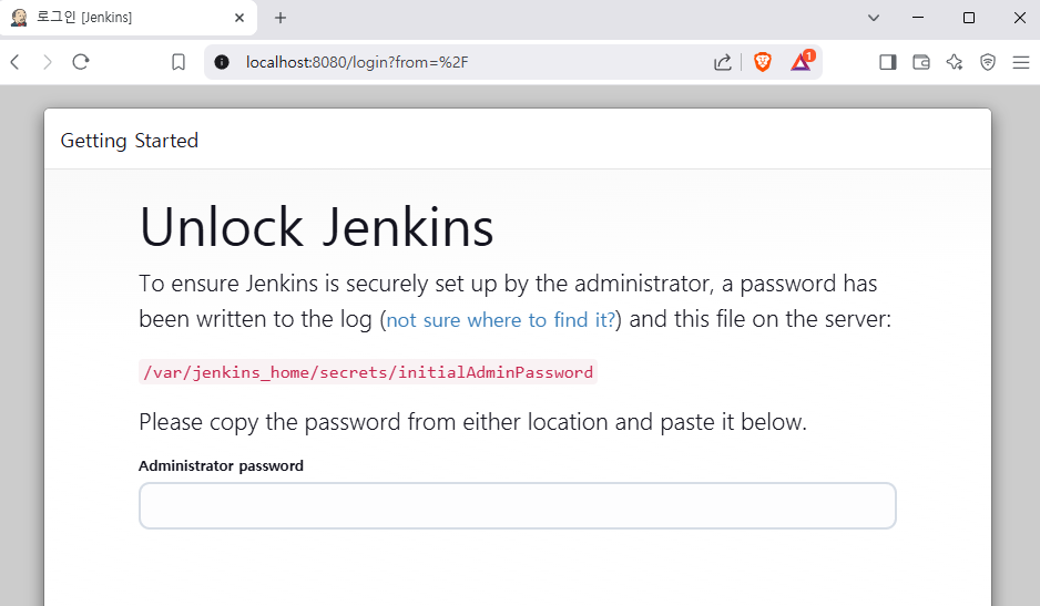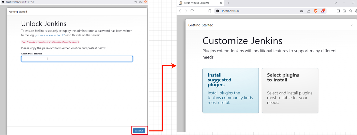 - 이제 브라우저에서 http://localhost:3000에 접속하면 Jenkins 설치 앱이 실행된다.