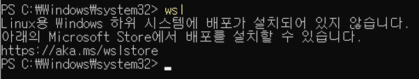 재부팅 후에 파워셸에 WSL을 입력하면 아래와 같이 배포판을 MS Store에서 설치하라는 문구가 뜬다.