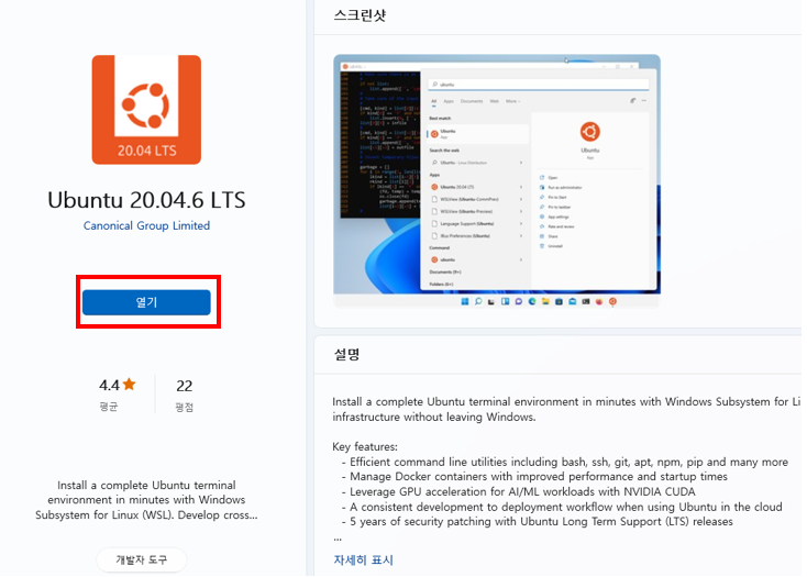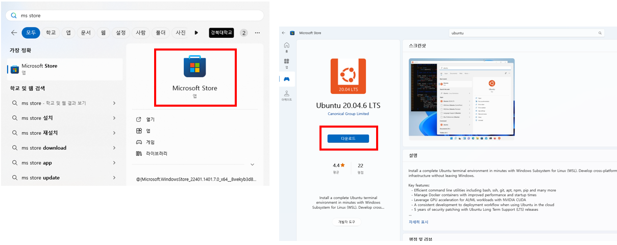 이제 본격적으로 MS Store에 들어가서 Ubuntu 20.04 LTS버전을 설치해준다.