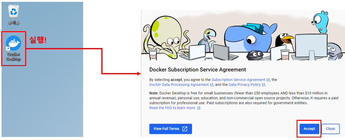 그러면 바탕화면에 도커 아이콘이 뜰텐데 실행!, 수락하면 된다.
