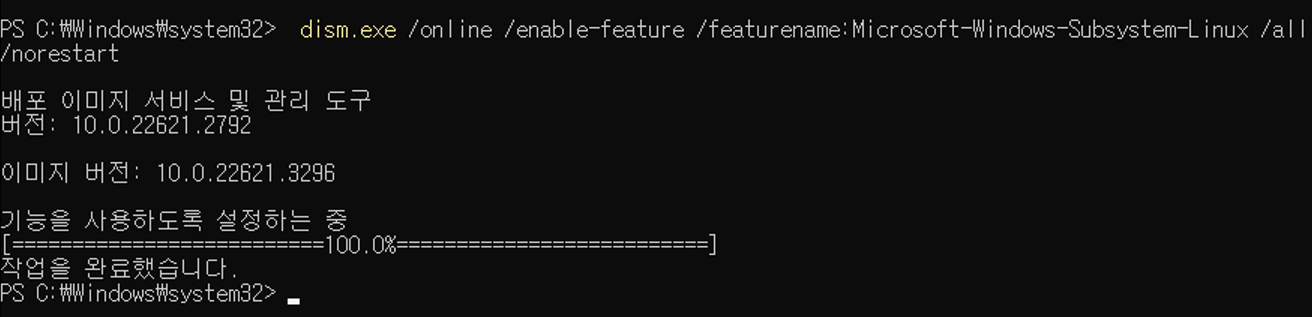 # WSL을 활성화 시키는 명령어, 이를 통해 VirtualMachinePlatform 기능을 사용할 수 있다.
