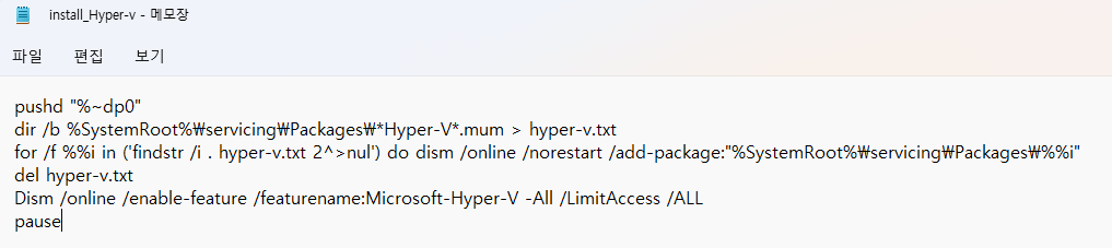 우분투 배포판을 설치하기 전에 배치파일을 만들어 아래 코드를 작성해준다.