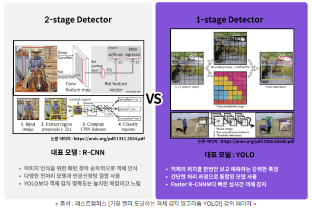 기존에 있던 객체 감지 모델인 "R-CNN" 같은 경우,이미지 안에 객체가 있을 만한 부분을 미리 얻어, 컨볼루션 넷을 이용해 특징을 추출하는 등의 여러 과정을 거쳤었다. 하지만 'YOLO'에서는 이 과정을 간략화 시켜주어, 이미지를 한번 제대로 스캔하고 객체의 특징과 경계선을 계산하는 부분만 신경쓰면 된다. 더 나가아 YOLO v5 의 경우, 실시간으로 82 ~158 FPS까지 객체들을 탐지하여 더 많은 객체식별을 처리할 수 있게 되었다. 기존에 쓰던 많은 기업들이 기존에 쓰던 R-CNN모델에서 욜로모델로 같아타게 된 것도, 이러한 이유가 큰 작용을 하였다.